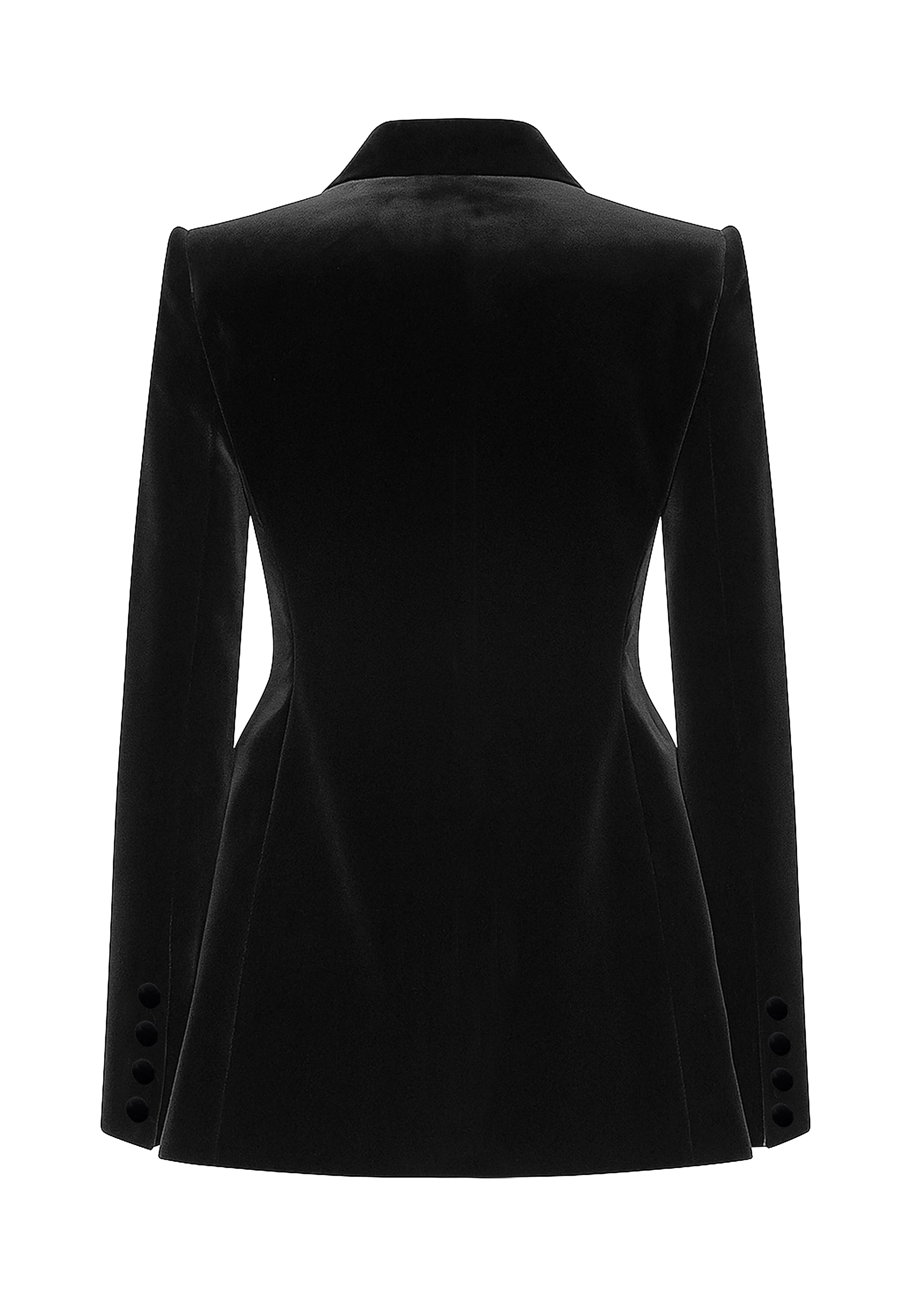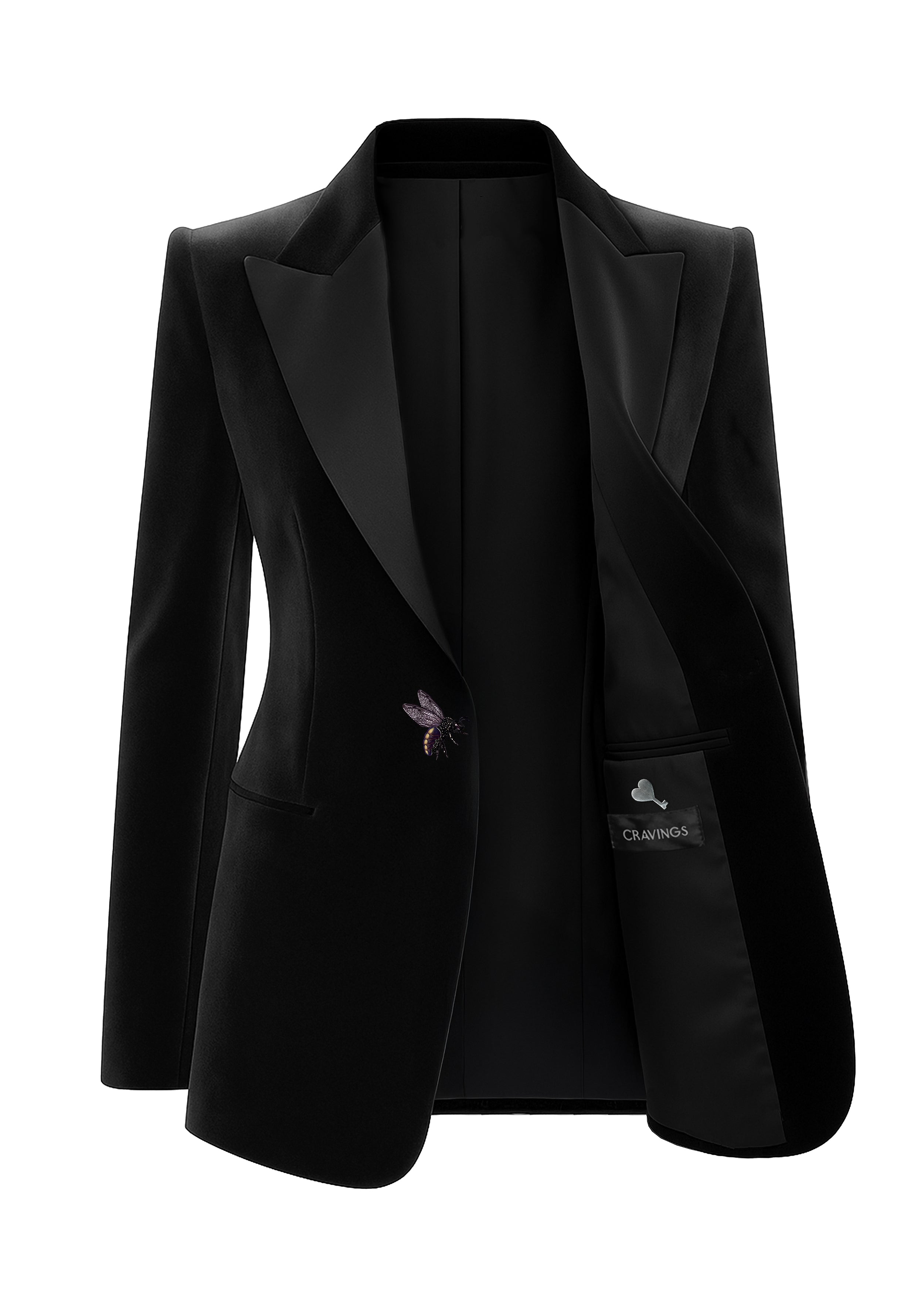 The Melissa Jacket, crafted in sumptuous velvet and is brought to life with hand-embroidered bees that add a touch of quiet whimsy to its polished silhouette. Each motif is stitched with precision, creating a delicate interplay of texture, depth, and light. Designed with understated elegance and a hint of intrigue to elevate both day and evening dressing, the jacket carries an effortless sophistication and refined charm, where softness meets structure and detail meets intention.